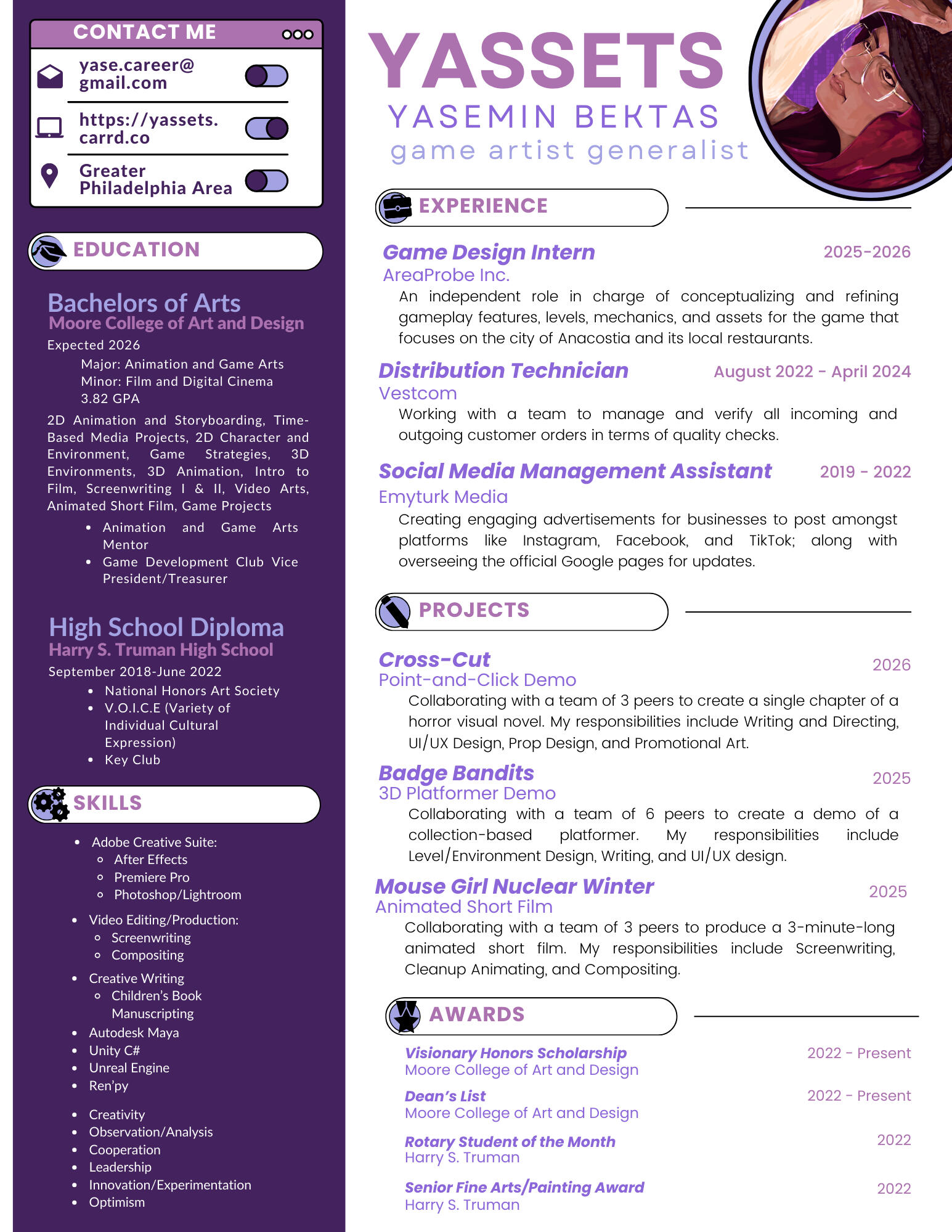 Yasemin Bektas (YASSETS) is a game artist and writer whose strengths lie in UI/UX and level design. Her work demonstrates an interest in horror and the supernatural, as well as having fun with the wild western genre. She would love to work on narrative-driven games that bring communities together through vivid, diverse, and underrepresented storytelling.Yasemin is working towards her BA in Animation and Game Arts – with a minor in Film and Digital Cinema – from Moore College of Art and Design in Philadelphia. There, she has created multiple game demos of various genres and interned to build a game from scratch for a company in Washington, D.C.